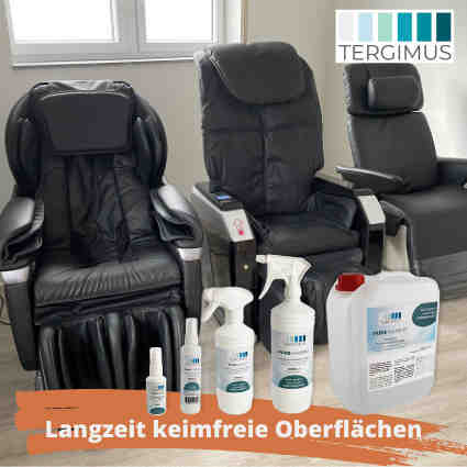"Ми знаємо від наших комерційних клієнтів, що дезінфекція поверхонь у громадських місцях, таких як лікарні та соціальні установи, займає багато часу і коштує дорого. Це також є проблемою в спортзалах, приймальнях або релаксаційних острівцях у компаніях, - розповідає Рьодеске. "Дезінфекція після кожного використання займає багато часу і не підходить для повсякденного використання. Без відповідних засобів гігієни цей ринок був би для нас повністю закритий", - впевнений він. У пошуках відповідного засобу для поверхонь масажних крісел він натрапив на компанію ТЕРГІМУС названий на честь латинського терміну tergere - очищати. Обидві компанії дбають про здоров'я та сталий розвиток, тож співпраця була очевидною. Медичний очищувач PUREMANENT виготовлений на водній основі, а також планується розливати його у пляшки з морського пластику.