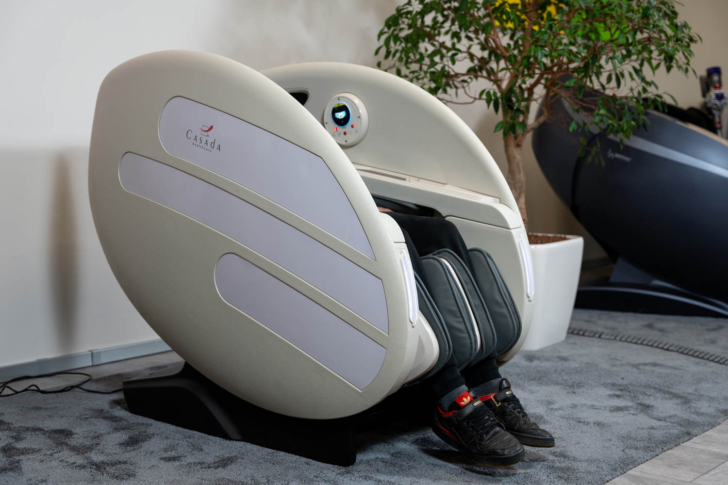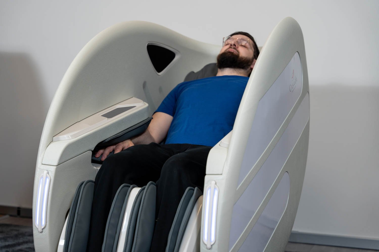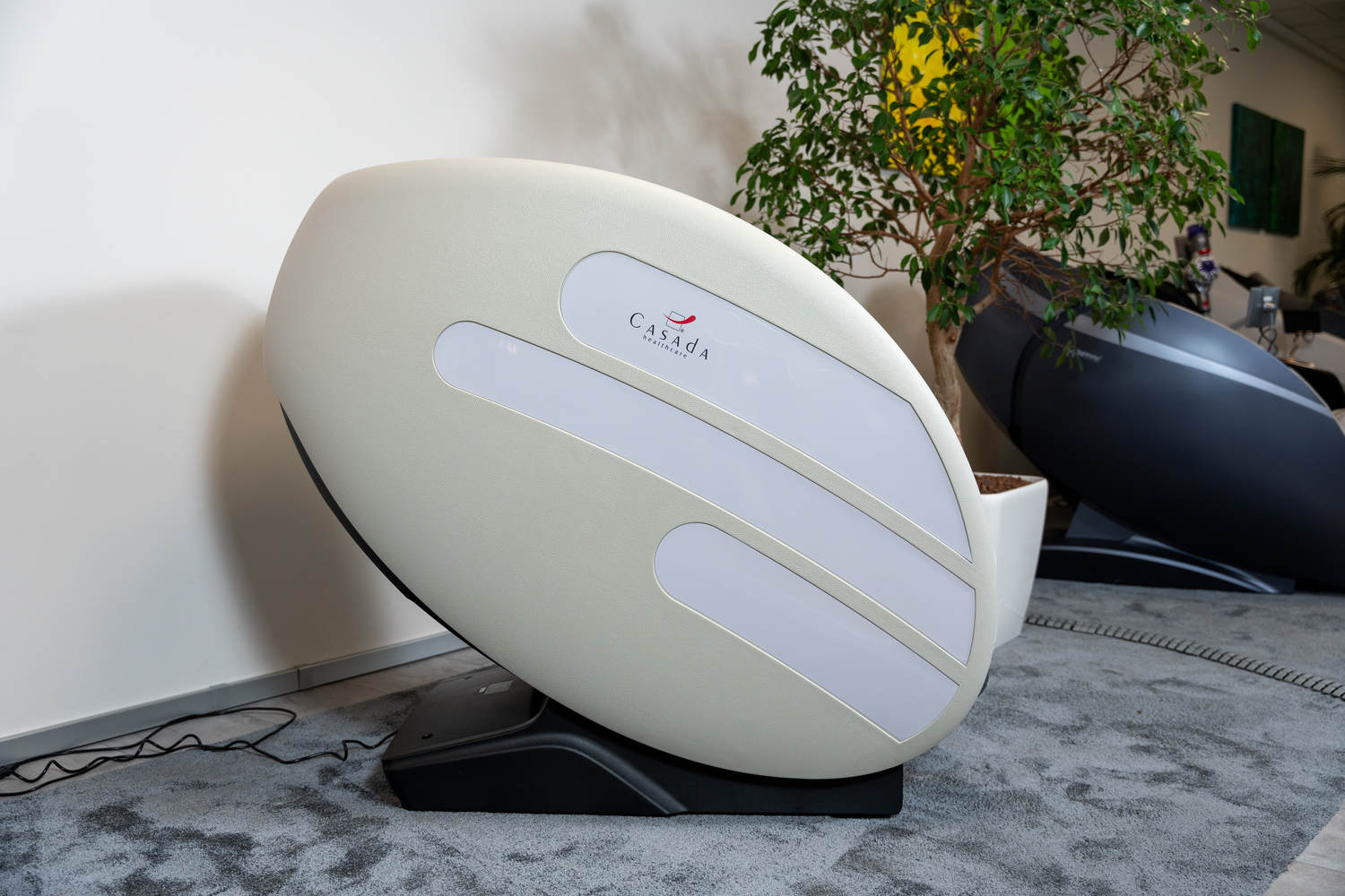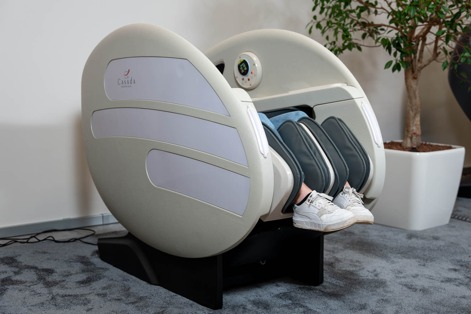 Casada Atlas - це унікальне масажне крісло, яке можна використовувати для створення зон релаксації в громадських місцях. громадських місцях. Його особливістю є футуристичний капсулоподібний дизайн, який приховує в собі передові технології масажу. Важливо, що положення напівлежачи та заглиблені боковини крісла забезпечують користувачеві безтурботне розслаблення з відчуттям безпеки. відчуття безпеки і усамітнення навіть у дуже переповнених приміщеннях.