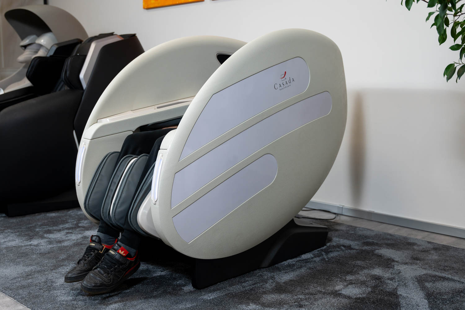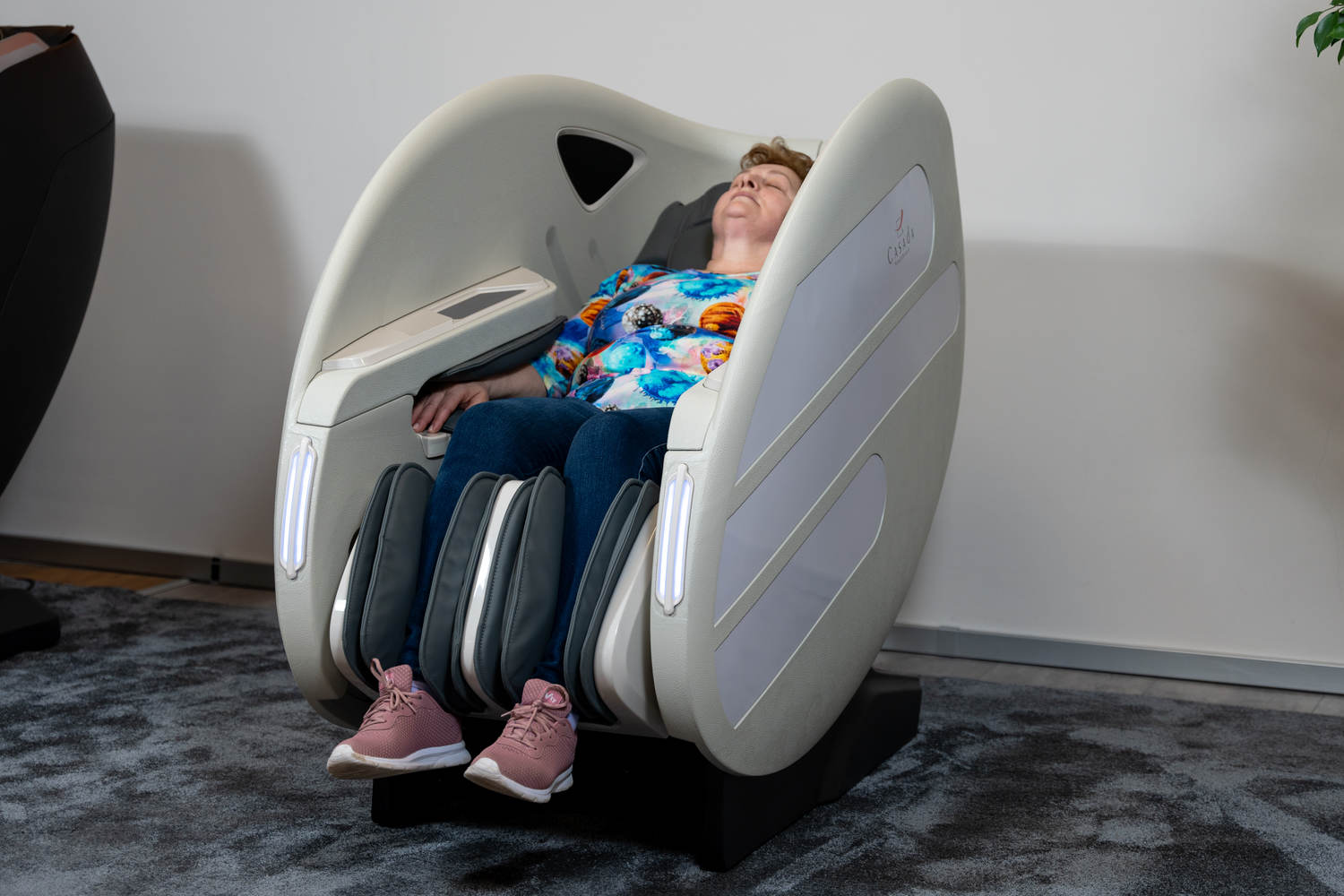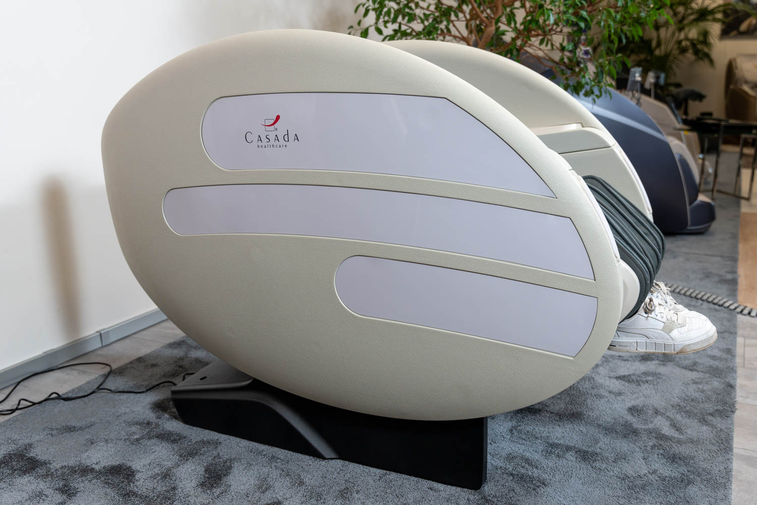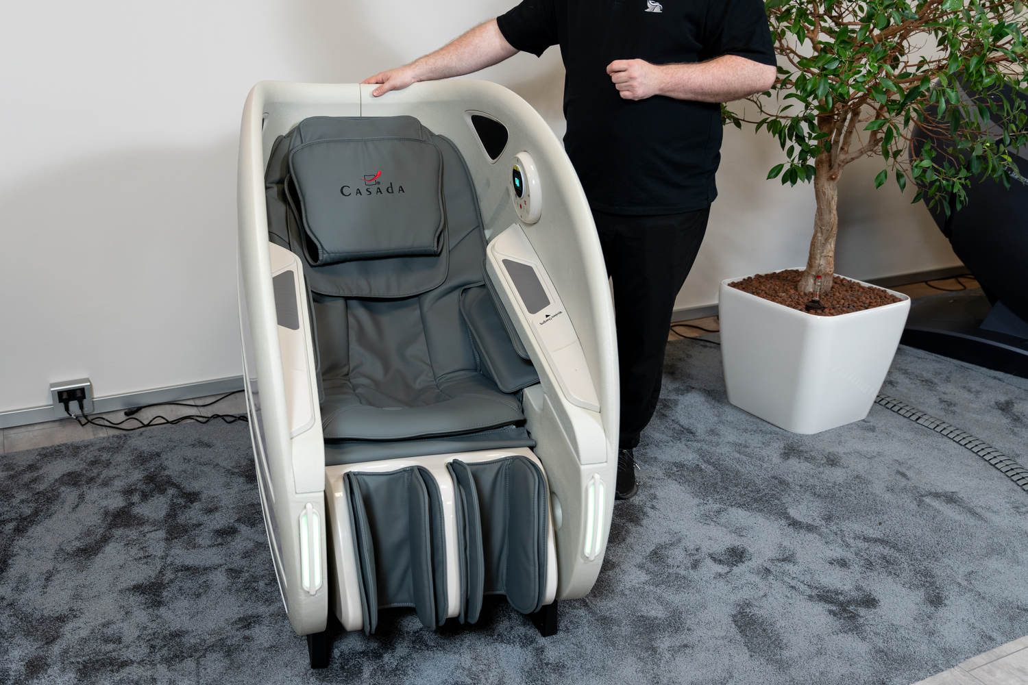 Casada Atlas - це унікальне масажне крісло, яке можна використовувати для створення зон релаксації в громадських місцях. громадських місцях. Його особливістю є футуристичний капсулоподібний дизайн, який приховує в собі передові технології масажу. Важливо, що положення напівлежачи та заглиблені боковини крісла забезпечують користувачеві безтурботне розслаблення з відчуттям безпеки. відчуття безпеки і усамітнення навіть у дуже переповнених приміщеннях.