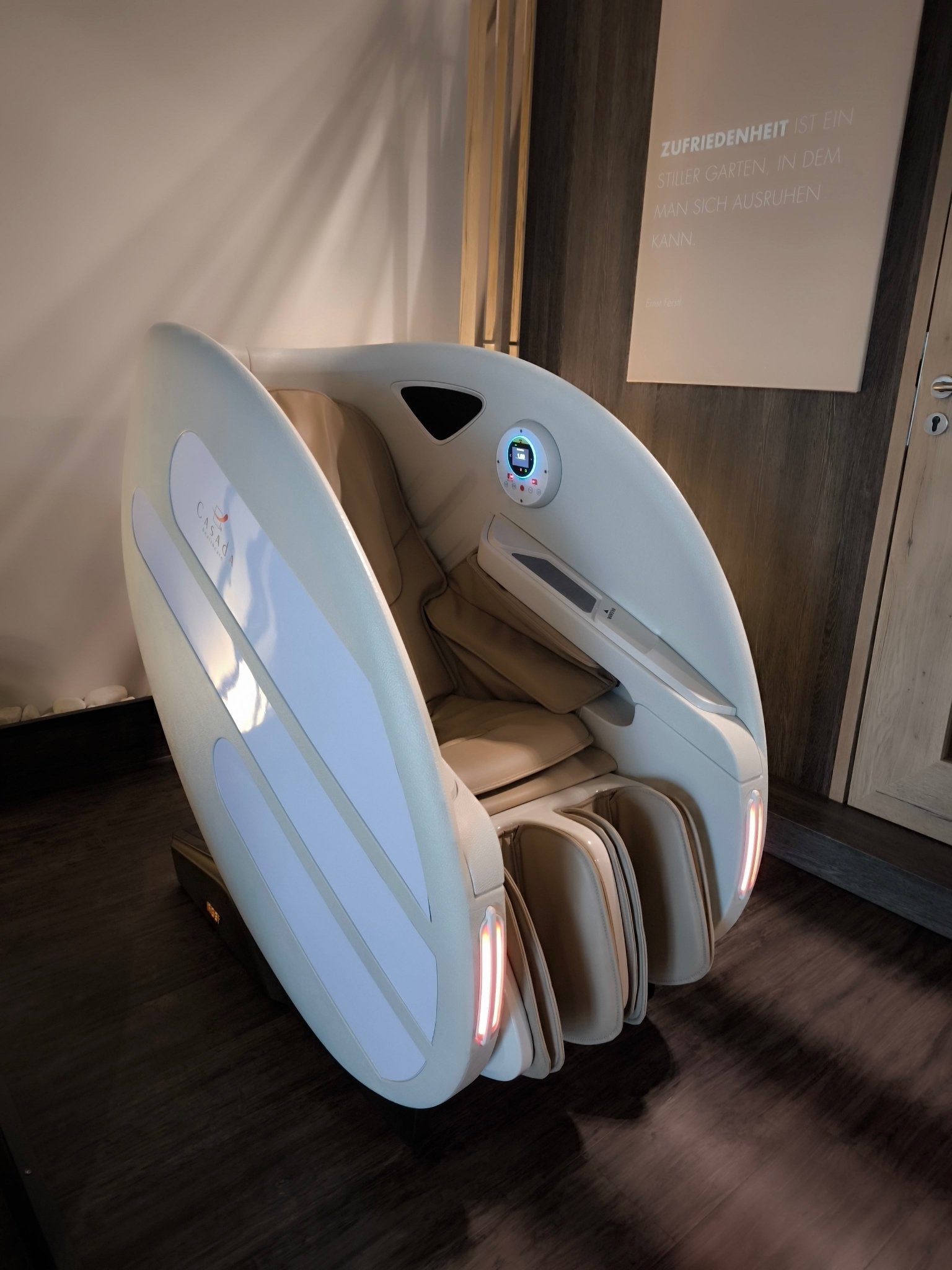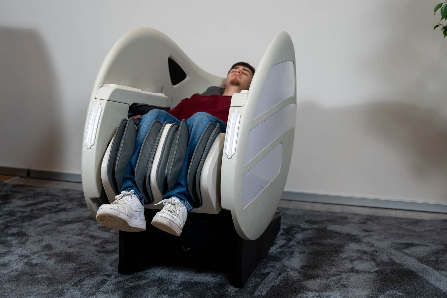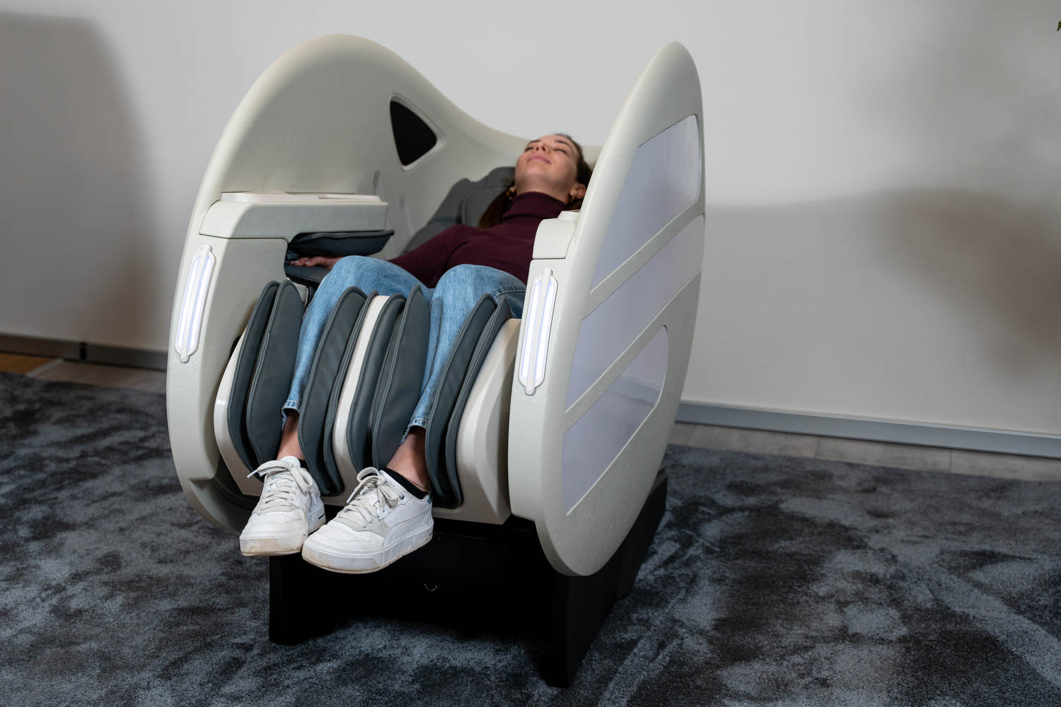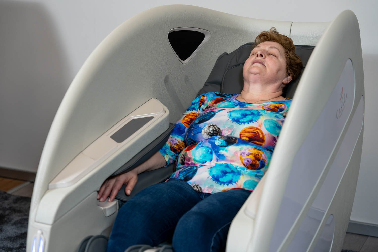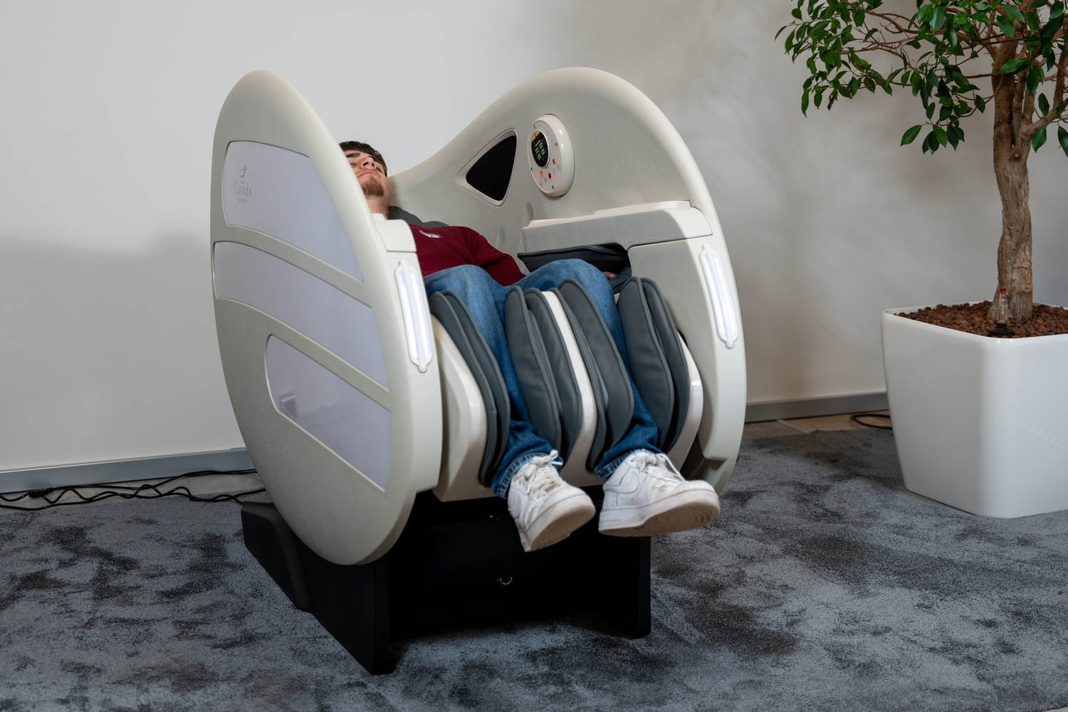 Casada Atlas - це унікальне масажне крісло, яке можна використовувати для створення зон релаксації в громадських місцях. громадських місцях. Його особливістю є футуристичний капсулоподібний дизайн, який приховує в собі передові технології масажу. Важливо, що положення напівлежачи та заглиблені боковини крісла забезпечують користувачеві безтурботне розслаблення з відчуттям безпеки. відчуття безпеки і усамітнення навіть у дуже переповнених приміщеннях.