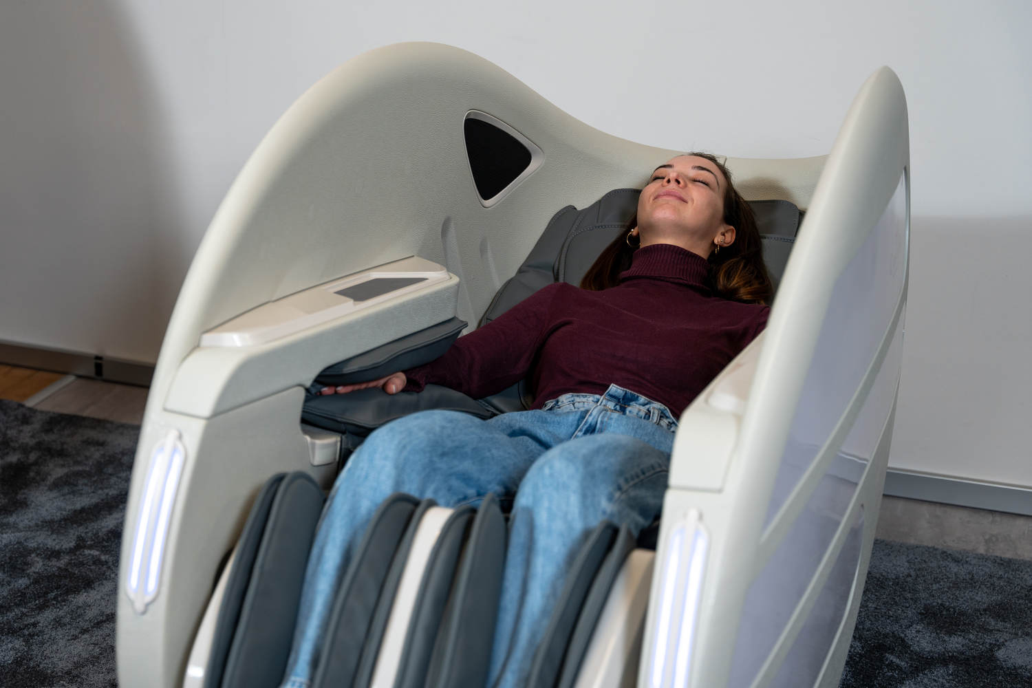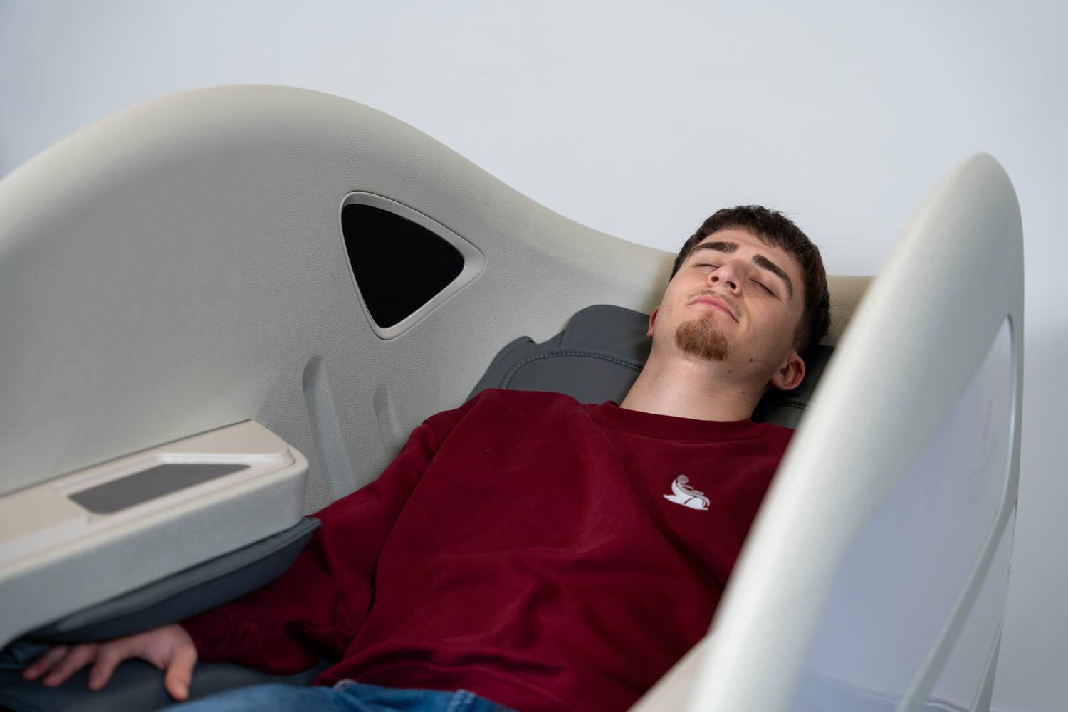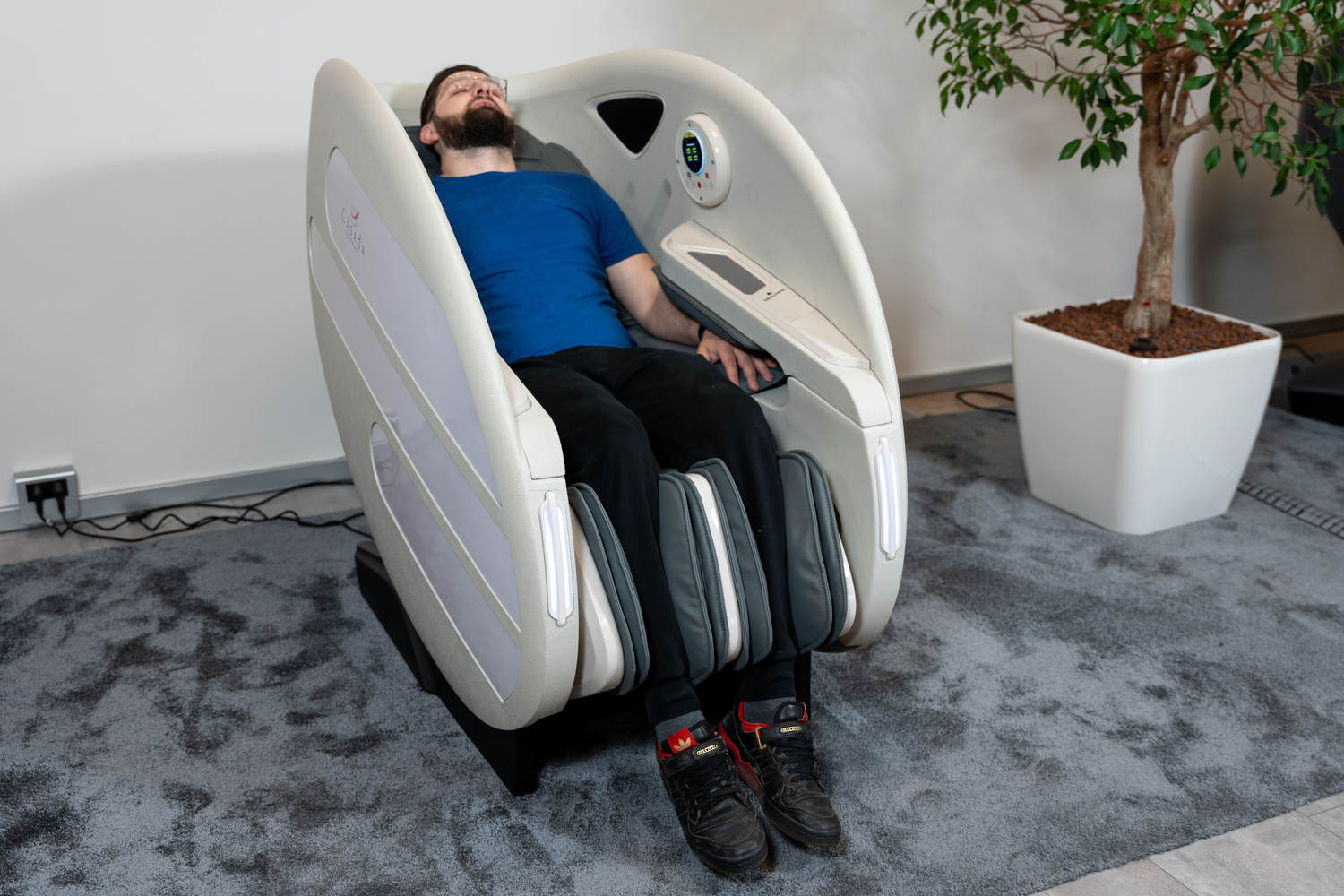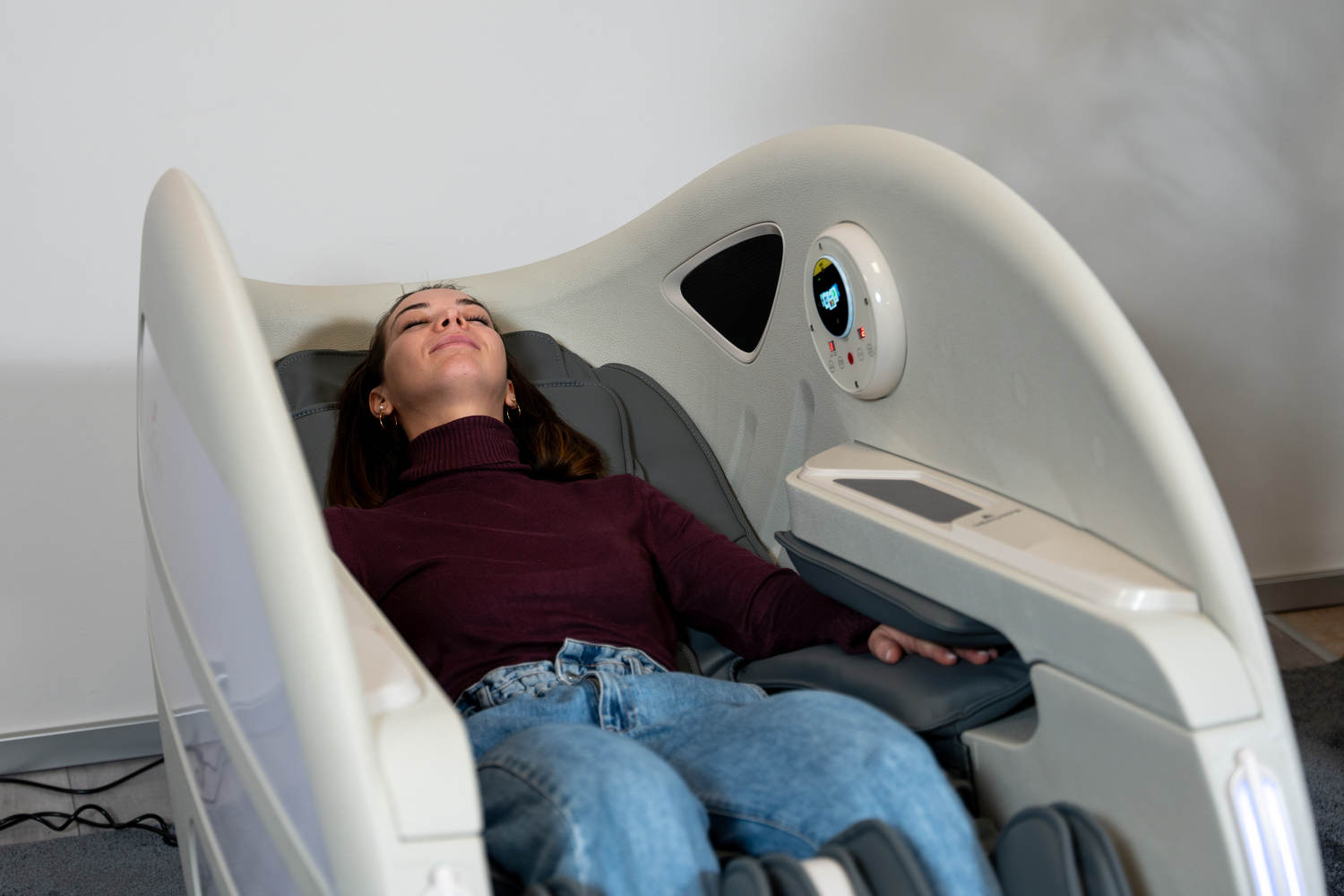 Casada Atlas - це унікальне масажне крісло, яке можна використовувати для створення зон релаксації в громадських місцях. громадських місцях. Його особливістю є футуристичний капсулоподібний дизайн, який приховує в собі передові технології масажу. Важливо, що положення напівлежачи та заглиблені боковини крісла забезпечують користувачеві безтурботне розслаблення з відчуттям безпеки. відчуття безпеки і усамітнення навіть у дуже переповнених приміщеннях.