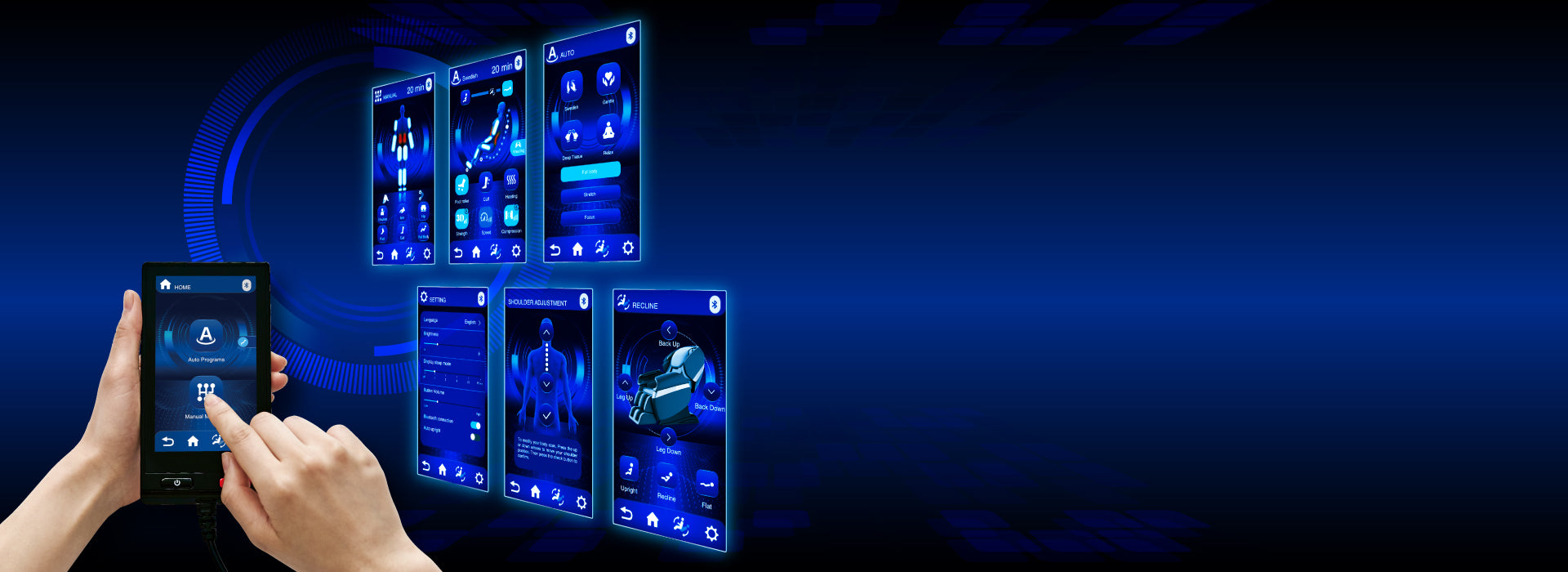 Відчуйте повне розслаблення завдяки інтуїтивно зрозумілому сенсорному екрану нашого масажного крісла. Лише одним дотиком ви можете легко налаштувати кожен аспект масажу - від інтенсивності до техніки.