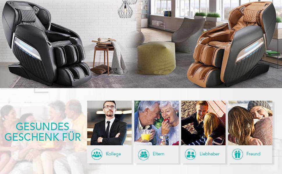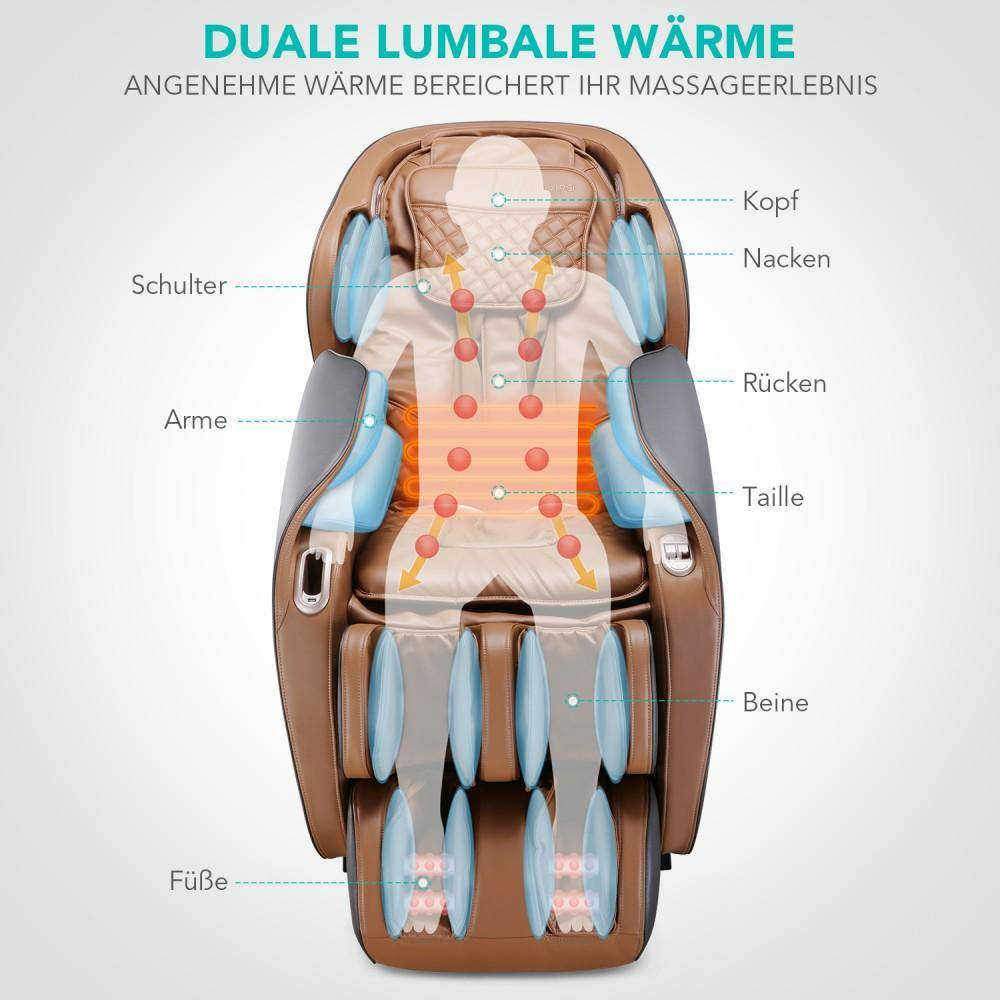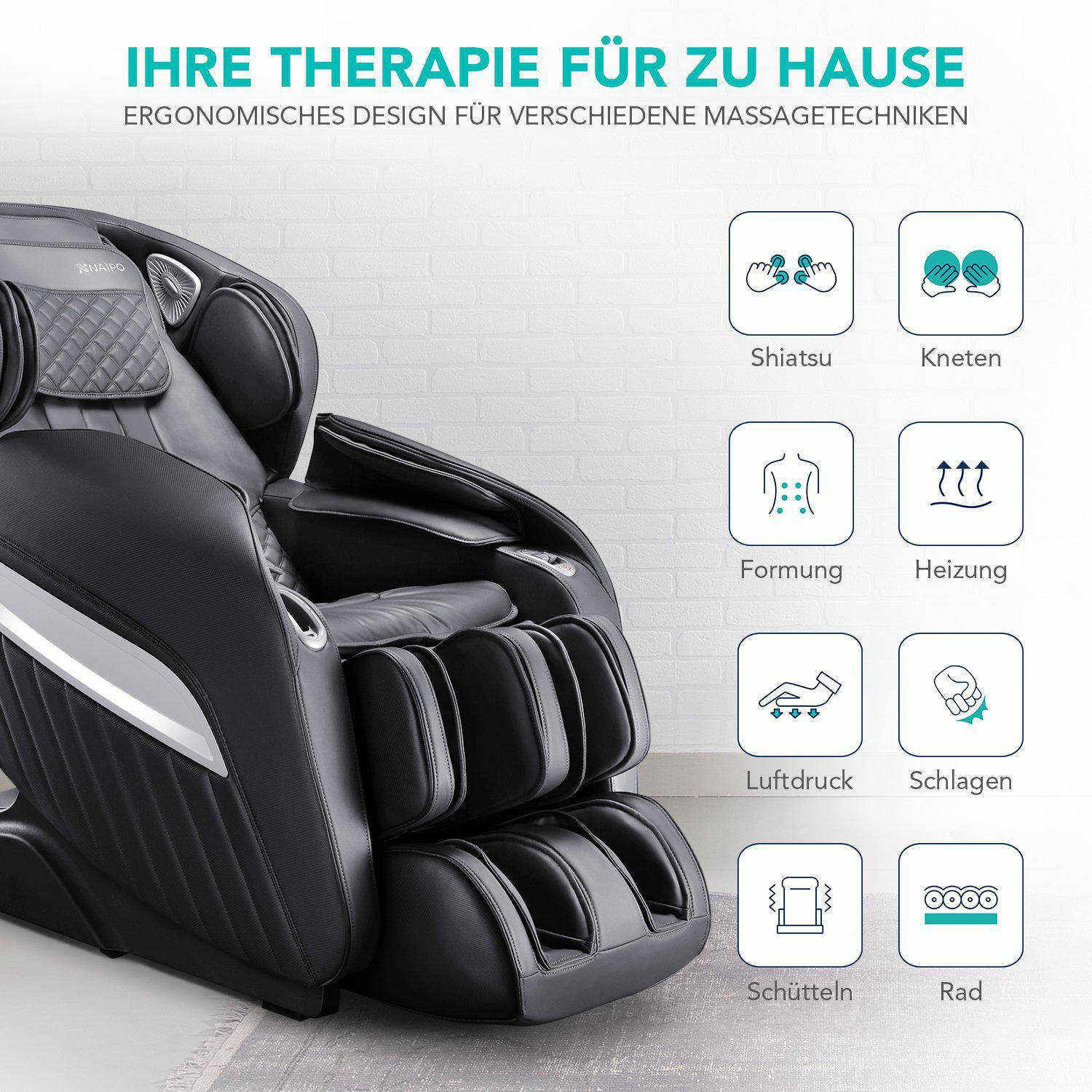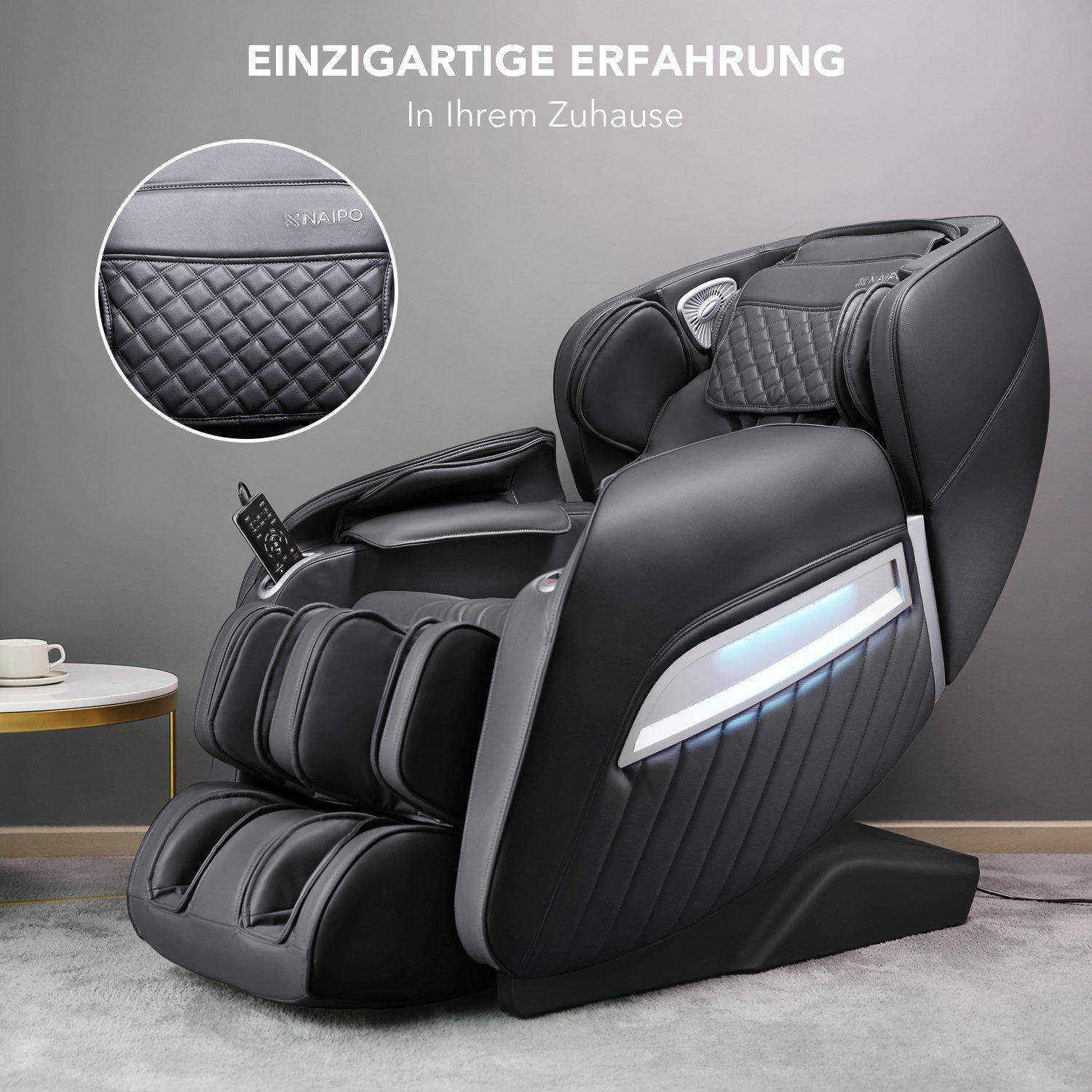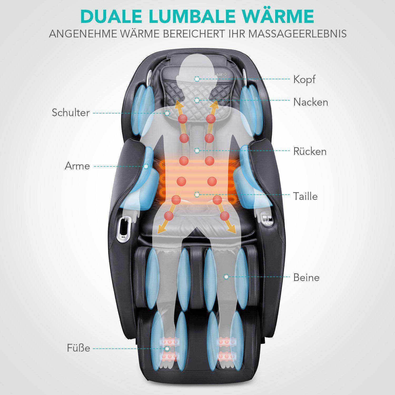 Незважаючи на привабливий зовнішній вигляд, є вагома причина, чому ви не повинні обмежуватися лише зовнішнім виглядом вашого нового масажного дива: За допомогою інтуїтивно зрозумілого пульта дистанційного керування ви можете насолоджуватися оздоровчою релаксаційною терапією з голови до ніг одним натисканням кнопки. Широкий вибір положень плечей, рівнів швидкості, рухів роликів та інтенсивності повітряного тиску гарантує масаж, який повністю відповідає вашим уподобанням. Спеціально створені дві індивідуально регульовані позиції "нульової гравітації": Під оптимальним розвантаженням хребта ви можете насолоджуватися унікальним відчуттям невагомості, насолоджуючись зручним сидінням "новачка". Також заслуговують на похвалу високоякісні подушки безпеки і масажні ролики в області підошви ніг, які розслаблюють м'язи і сприяють здоровій рухливості. Тим часом, потужна функція підігріву огортає поперек затишним теплом і робить "Einsteiger" вашим новим місцем гарного самопочуття.