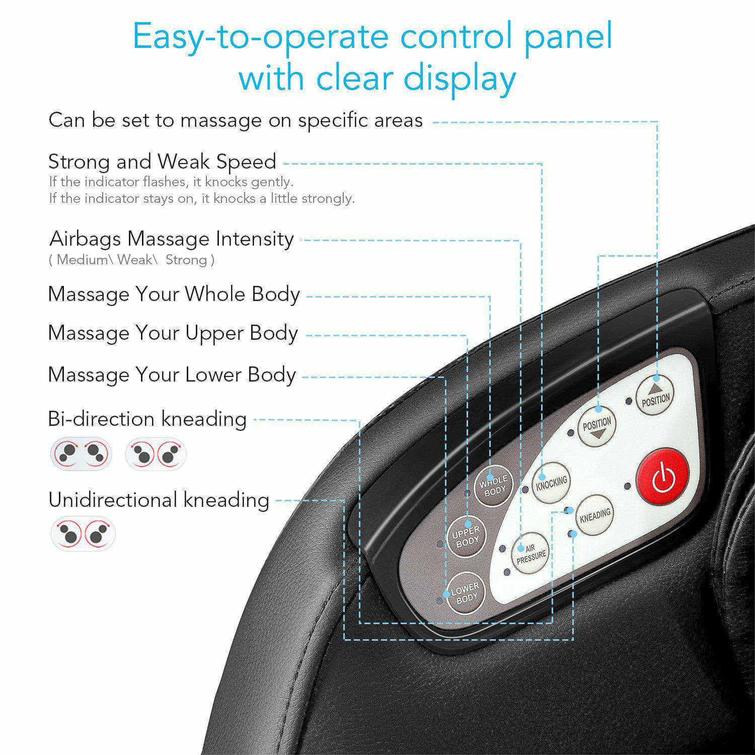 За допомогою панелі управління, інтегрованої в правий підлокітник, можна налаштувати масаж всього тіла, який охоплює три частково регульовані зони масажу. "Компакт" володіє численними масажними функціями, які включають в себе, крім розминання, повітряний тиск і техніку ши-ацу. Чудовий постукуючий масаж призначений спеціально для розслаблення сідниць завдяки складним масажним роликам. Додаткова компресія сприяє рухливості стегон завдяки повітряним подушкам. Режим повітряного тиску підтримує кращу циркуляцію крові з м'яким розтягуванням стегон і, таким чином, запобігає серйозним захворюванням. Стимулюючи важливі акупунктурні точки, біонічні масажні ролики допомагають зняти м'язовий біль і скутість. За допомогою функції таймера ви можете встановити тривалість масажу індивідуально.