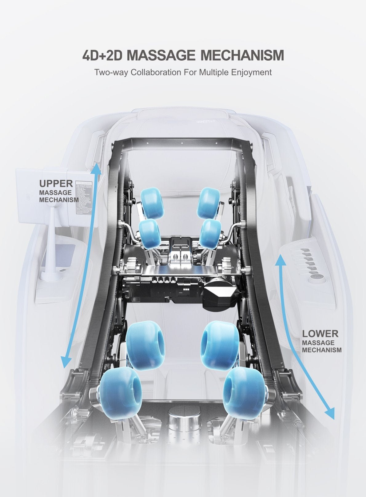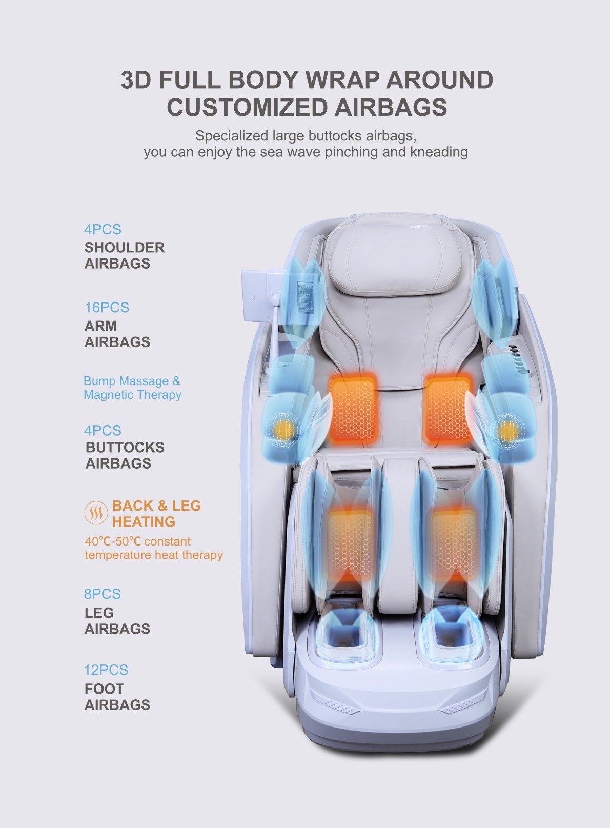 4D+2D Плавно регульована спинка Знімна оббивка спинки Голосовий вихід Голосовий контроль Функція таймера з автоматичним вимкненням Транспортувальні коліщатка Гніздо для зарядки USB Регульований таймер Положення нульової гравітації (невагомість) Дизайн "нульових стінок